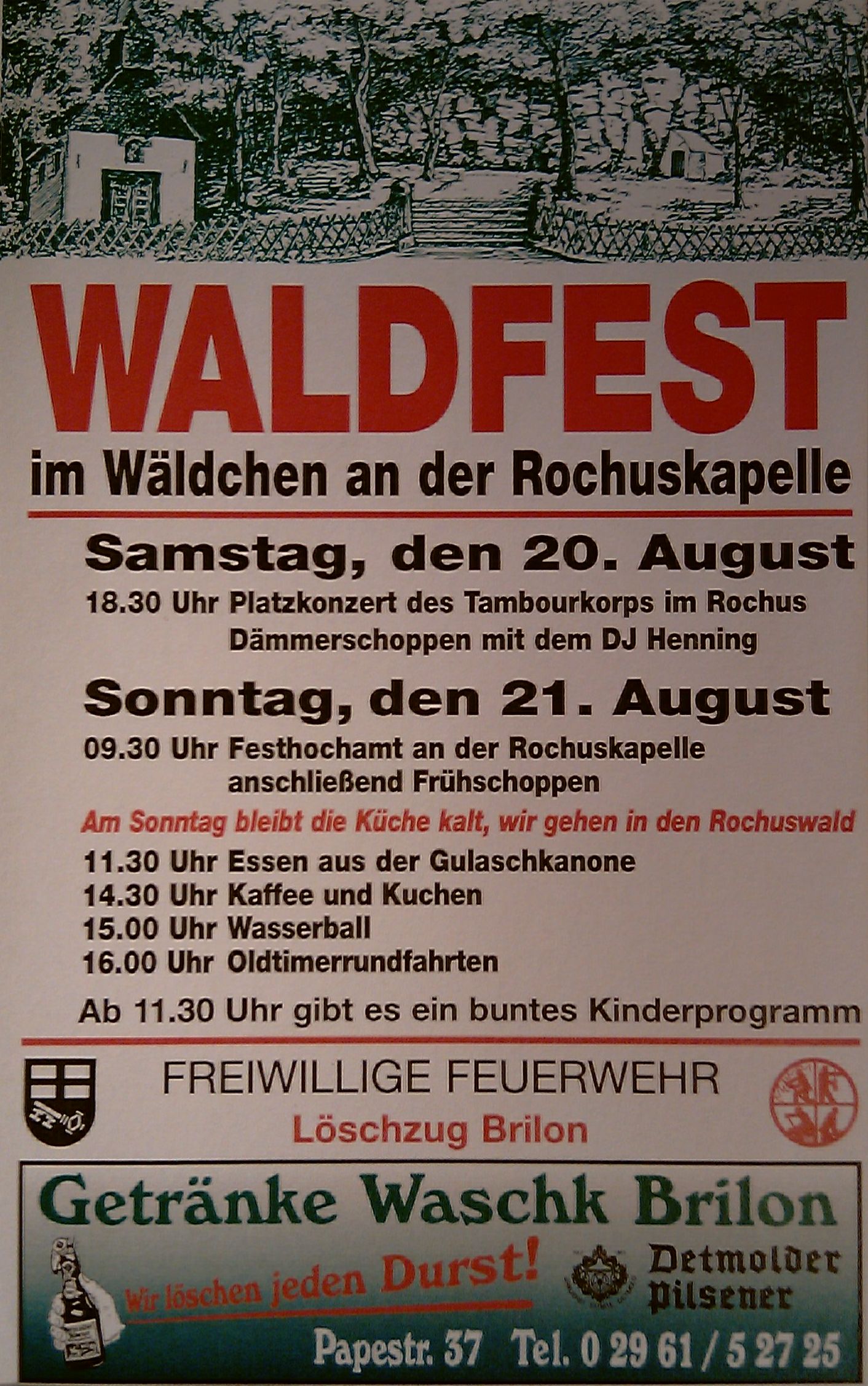 Am 20. und 21. August 2011 findet, immerhin seit über 50 Jahren, das Waldfest des Löschzuges Brilon im Rochuswäldchen statt.
