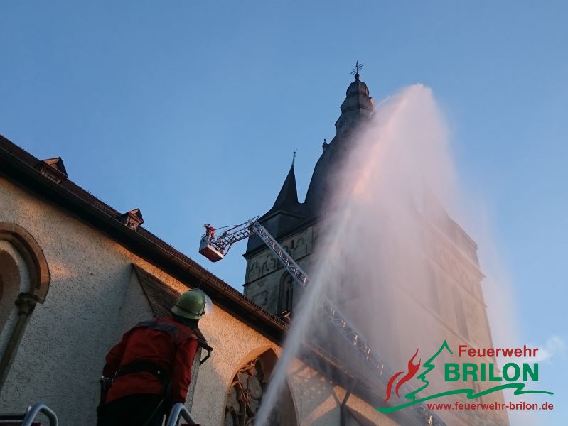 Wahrzeichen von Brilon brennt, so lautete die Alarmmeldung zu einer anspruchsvollen Übung des Löschzug Brilon. Nach einem Blitzeinschlag kam es zu einem Entstehungsbrand ausgerechnet in der Kirchturmspitze der Propsteikirche. Ein Feuer in etwa 60 Metern Höhe stellt die Feuerwehr vor besondere Probleme. Im Rahmen der Übung wurde zunächst erprobt, welche Turmhöhen mit dem Dachmonitor des TLF 4000 sowie mit verschiedenen Strahlrohren über die Drehleiter zu erreichen sind.