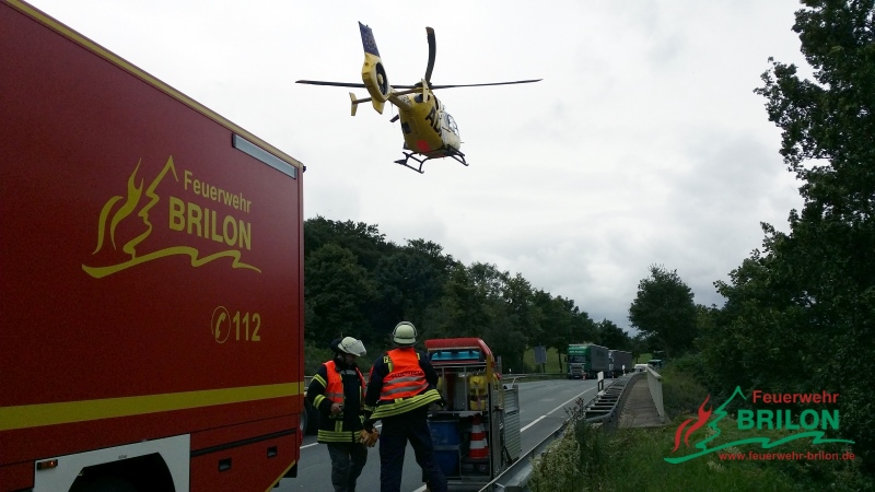 Brilon. Die Feuerwehr Brilon wurde am Dienstagmittag gegen 12.40 Uhr zu einem Verkehrsunfall auf der Umgehungsstraße – B 7 alarmiert. Dort waren am Abzweig Scharfenberg ein PKW und ein Krad kollidiert. Nach den ersten Meldungen sollten zwei Personen im PKW eingeschlossen sein. Bei Eintreffen der Feuerwehr befanden sich die PKW Insassen bereits außerhalb des Fahrzeuges. Der Kradfahrer wurde schwer verletzt und mit dem Rettungshubschrauber in eine Spezialklink verlegt. Die ebenfalls schwer verletzte PKW Fahrerin und die leicht verletzte Beifahrerin wurde mit dem Rettungswagen ins Krankenhaus gefahren.