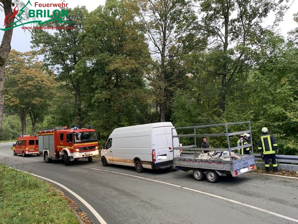 Vor Ort stellte sich die Lage weniger dramatisch dar: Ein Kleintransporter mit Anhänger hatte in einer S-Kurve seine Ladung verloren. Dabei stürzten Batteriepole eine Böschung hinunter. Diese wurden von der Feuerwehr eingesammelt und anschließend an den Fahrer des Transportfahrzeugs übergeben.