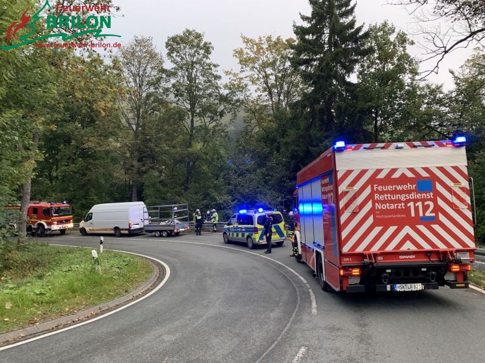 Hoppecke. Am heutigen Freitagmorgen (26.09.) wurde die Feuerwehr Brilon um 08:04 Uhr zu einem Einsatz mit dem Alarmstichwort „H2 ABC – LKW im Graben“ auf die L 870 zwischen Haus Gruß und Hoppecke alarmiert. Neben dem Löschzug Brilon und der Löschgruppe Hoppecke rückte aufgrund der Einsatzmeldung auch die kommunale ABC-Einheit aus.