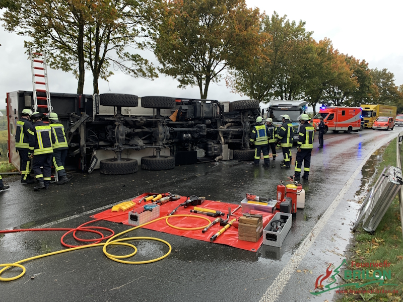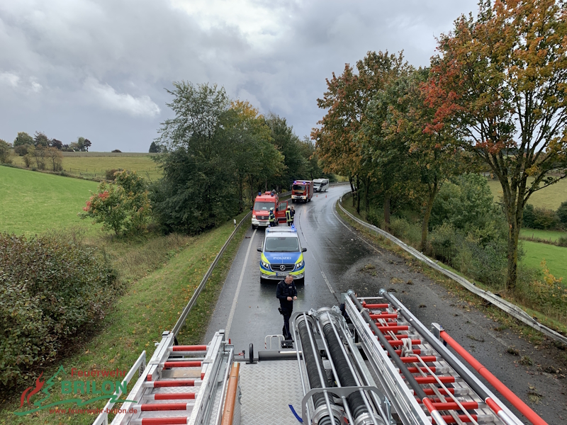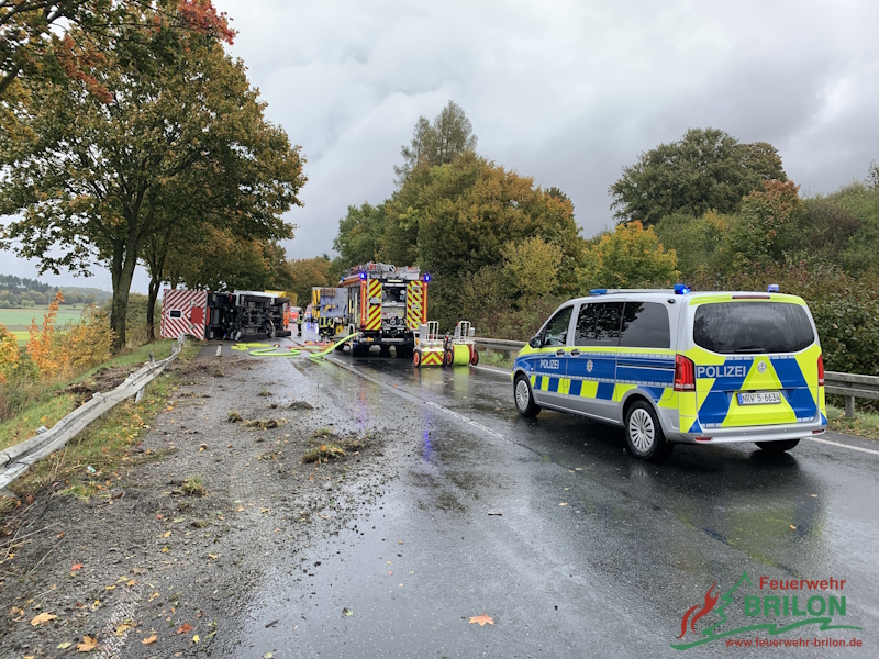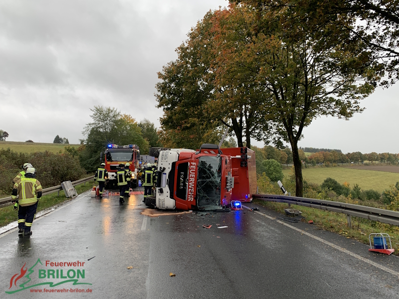 Brilon. Die Feuerwehr Brilon hat heute (05.10.2025, 14:15 Uhr) den Fahrer eines Feuerwehrfahrzeuges nach einem Unfall aus seinem Fahrzeug befreit.