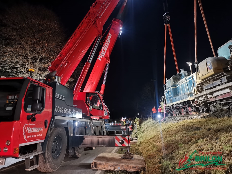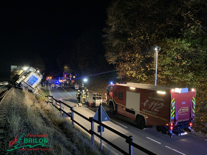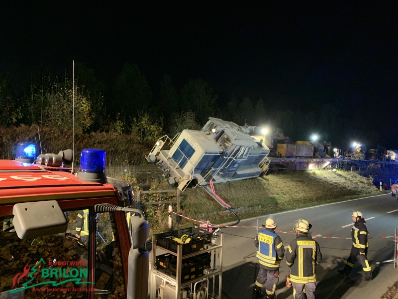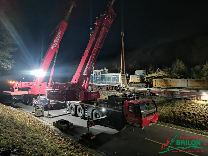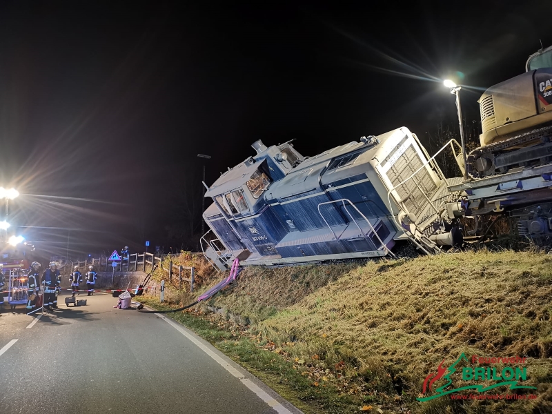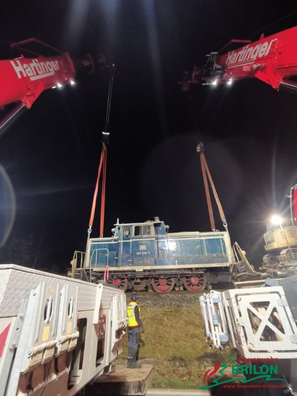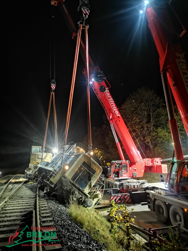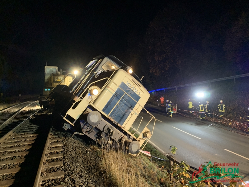 Bei Eintreffen der ersten Einsatzkräfte bot sich ein ungewöhnliches Bild: Im Rahmen einer Baumaßnahme war eine Lokomotive eines privaten Betreibers auf einem Gleis in Richtung Brilon entgleist. Die Lokomotive hatte dabei eine massive Schräglage eingenommen. Sie drohte auf die Bundesstraße B 251 zu kippen. Die Feuerwehr sicherte zunächst die Einsatzstelle ab und fing auslaufenden Dieselkraftstoff auf. Die Rangierlok war mit rund 1.800 Liter Diesel befüllt. Der Notfallmanager der Deutschen Bahn war ebenfalls vor Ort und koordinierte die weiteren Maßnahmen gemeinsam mit der Feuerwehr. Für die Bergung der Lokomotive und des entgleisten Waggons wurden zwei Spezialkräne angefordert. Bereits gegen 1:00 Uhr konnten die ersten Kräfte aus dem Einsatz entlassen werden.