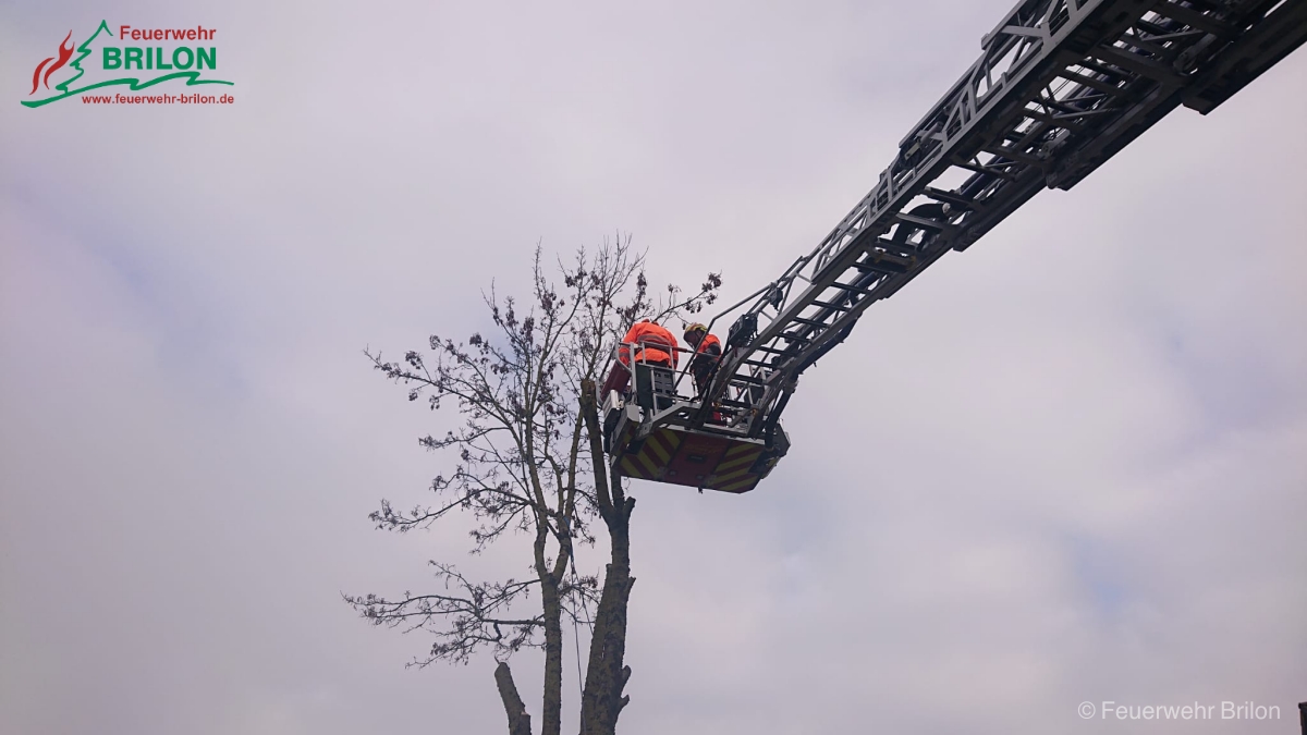 Für das Sägen aus dem Drehleiterkorb ist es erforderlich über die entsprechenden Feuerwehrlehrgänge – Technische Hilfe – Wald und den Drehleitermaschinisten – zu verfügen. Der 12 Meter hohe Baum wurde schrittweise von oben nach unten ausgedünnt und entästet. Als schließlich nur noch der dicke Stamm in die Höhe ragte, wurde dieser mit einem routinierten Schnitt in die dafür vorgesehene Schneise gefällt.