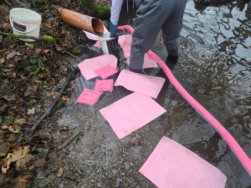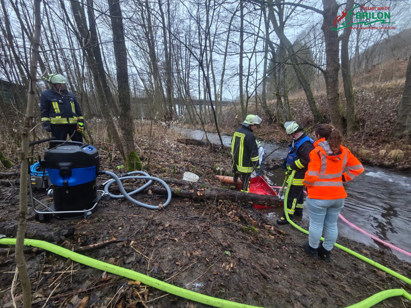 Parallel zu diesem Einsatz wurden am Samstag um 13:24 Uhr die Löschgruppen Hoppecke und Messinghausen zu einer Gewässerverunreinigung auf der Hoppecke alarmiert. Vor Ort stellten die Einsatzkräfte Ölschlieren auf dem Gewässer sowie einen deutlichen Heizöl- bzw. Dieselgeruch fest. Bei der Erkundung wurde im Industriegebiet „Im Lies“ ein Abflussrohr entdeckt, aus dem Heizöl austrat. Ursache war ein undichter, frisch betankter Heizöltank, aus dem das Öl über die Regenwasserkanalisation in den Fluss gelangt war.