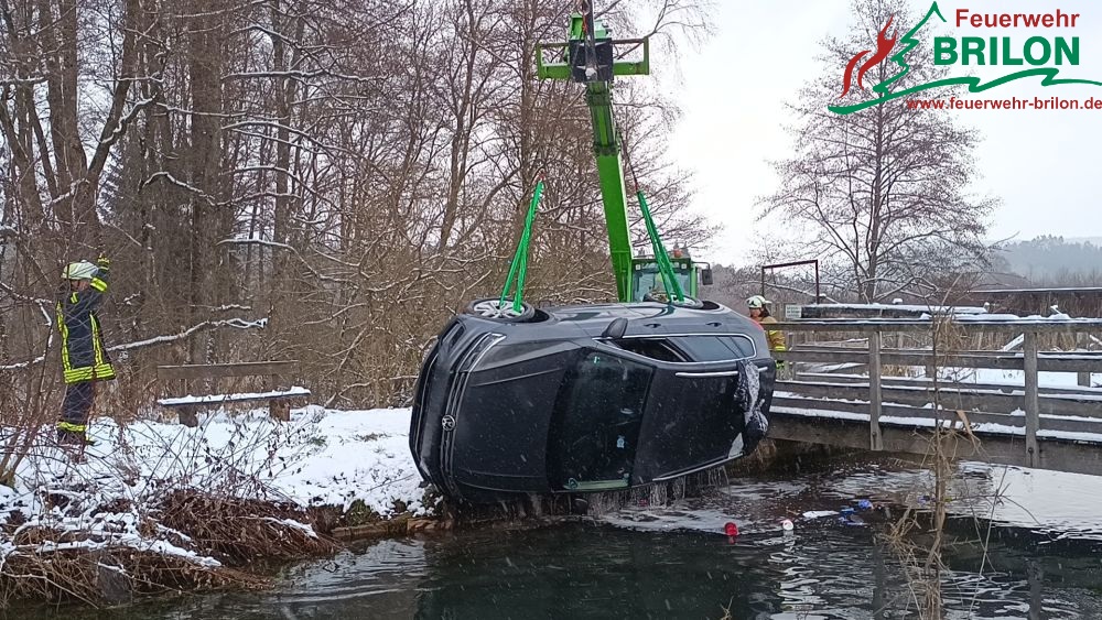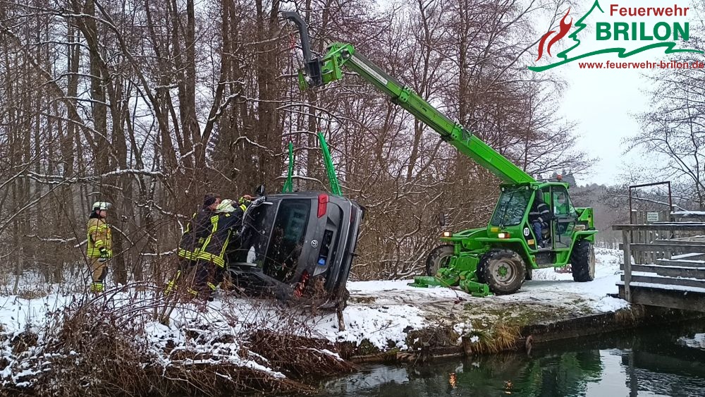 Brilon. Durch eine automatische eCall-Alarmierung am 03.01.2026 wurde um kurz vor 11.00 Uhr die Feuerwehr Brilon zu einer unklaren Lage an einem nahegelegenen Fluss bei Alme alarmiert. Bei dem Verkehrsunfall ist eine 24-jährige Fahrerin auf einem schneeglatten Waldweg auf der Suche nach einem Jagdhund durch ihr GPS-Gerät abgelenkt worden.