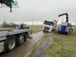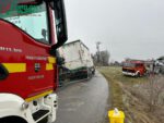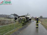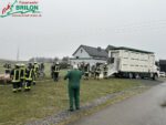 Alme. Die Löschgruppe Madfeld wurde am Samstag (14.02.) um 10:58 Uhr zu einem Hilfeleistungseinsatz nach Alme zum „Loh“, alarmiert. Vor Ort war ein LKW mit 80 Schweinen verunglückt. Der ebenfalls mit 80 Schweinen beladene, dreistöckige Anhänger lag vollständig umgekippt auf einem schmalen Feldweg. Da sich der Anhänger nicht mehr öffnen ließ, waren alle Tiere darin eingeschlossen.